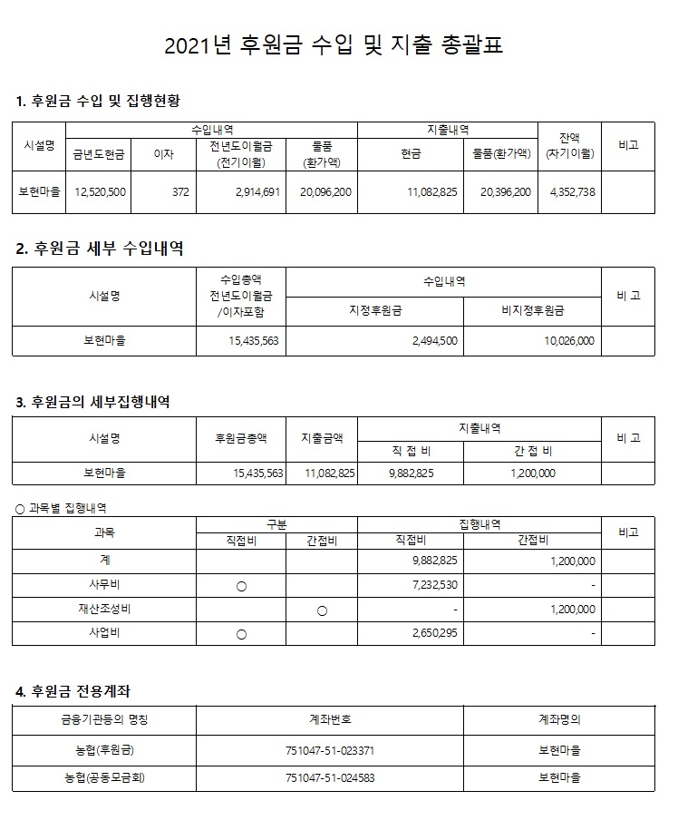 2021년 보현마을 후원금품 수입 및 지출내역 공고 페이지 정보 작성자 김원구 작성일22-04-06 18:04 조회4,823회 댓글0건 본문 2021년 보현마을 후원금품 수입 및 지출내역 공고 댓글목록 등록된 댓글이 없습니다. 이전글 다음글 목록
